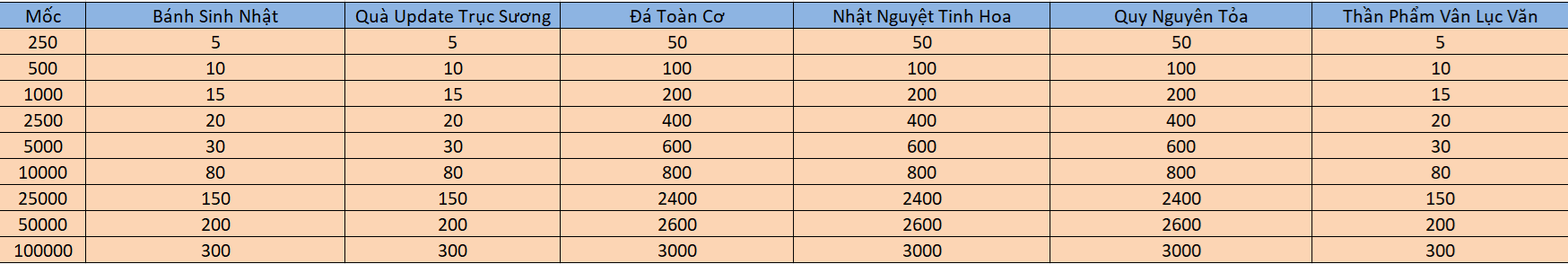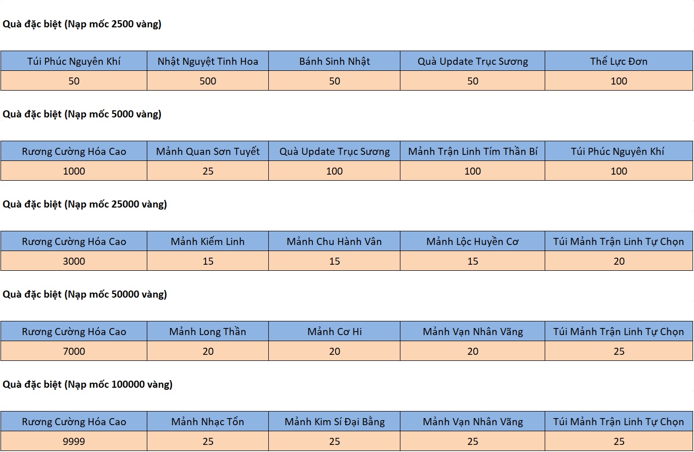 - Nạp tích lũy 2500 vàng sẽ nhận thêm QUÀ ĐẶC BIỆT 2 và x2 QUÀ TỪ MỐC 250 – MỐC NẠP