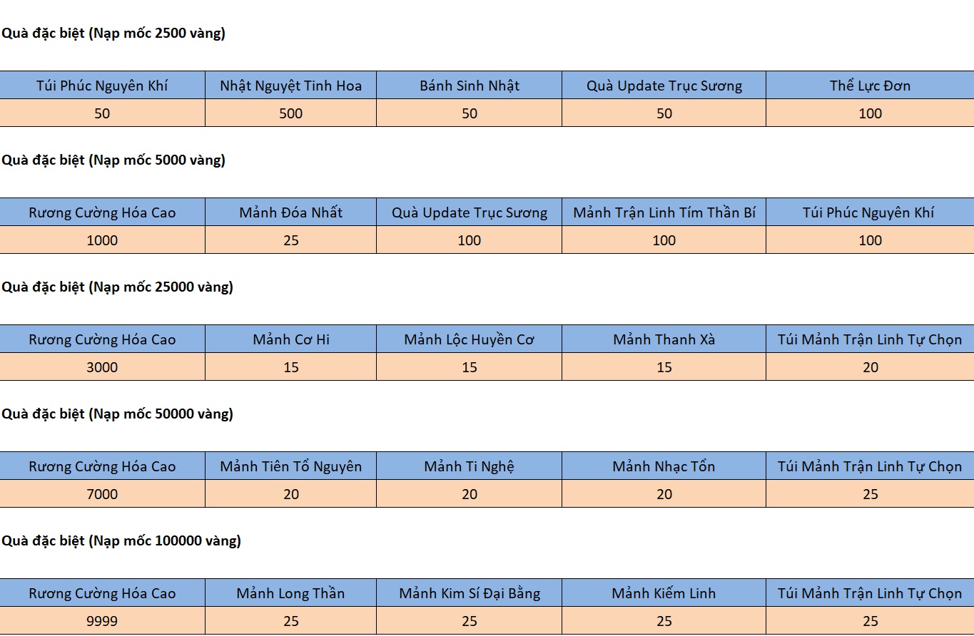 - Nạp tích lũy 2500 vàng trở lên sẽ nhận thêm QUÀ ĐẶC BIỆT 1 và x2 QUÀ TỪ MỐC 250 – MỐC NẠP