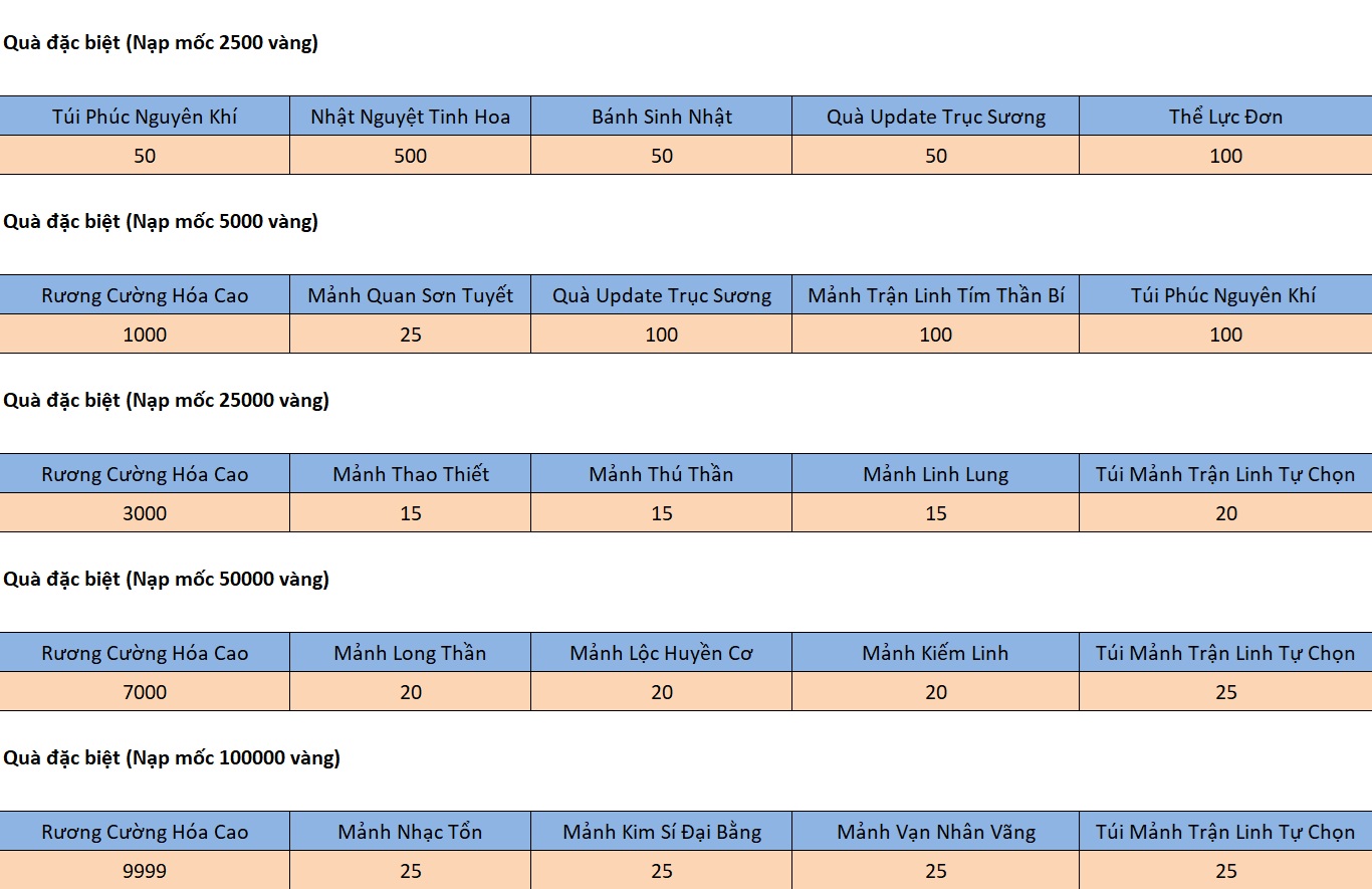 - Nạp tích lũy 2500 vàng sẽ nhận thêm QUÀ ĐẶC BIỆT 2 và x2 QUÀ TỪ MỐC 250 – MỐC NẠP