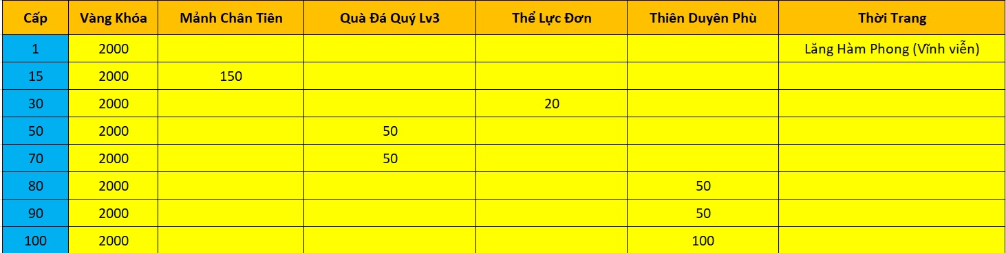trong 7 ngày Khai mở sv chư vị Nạp đủ vào game 1750 vàng sẽ nhận được gói quà QUỸ TRƯỞNG THÀNH TÂN THỦ bao gồm các phần quà dưới đây