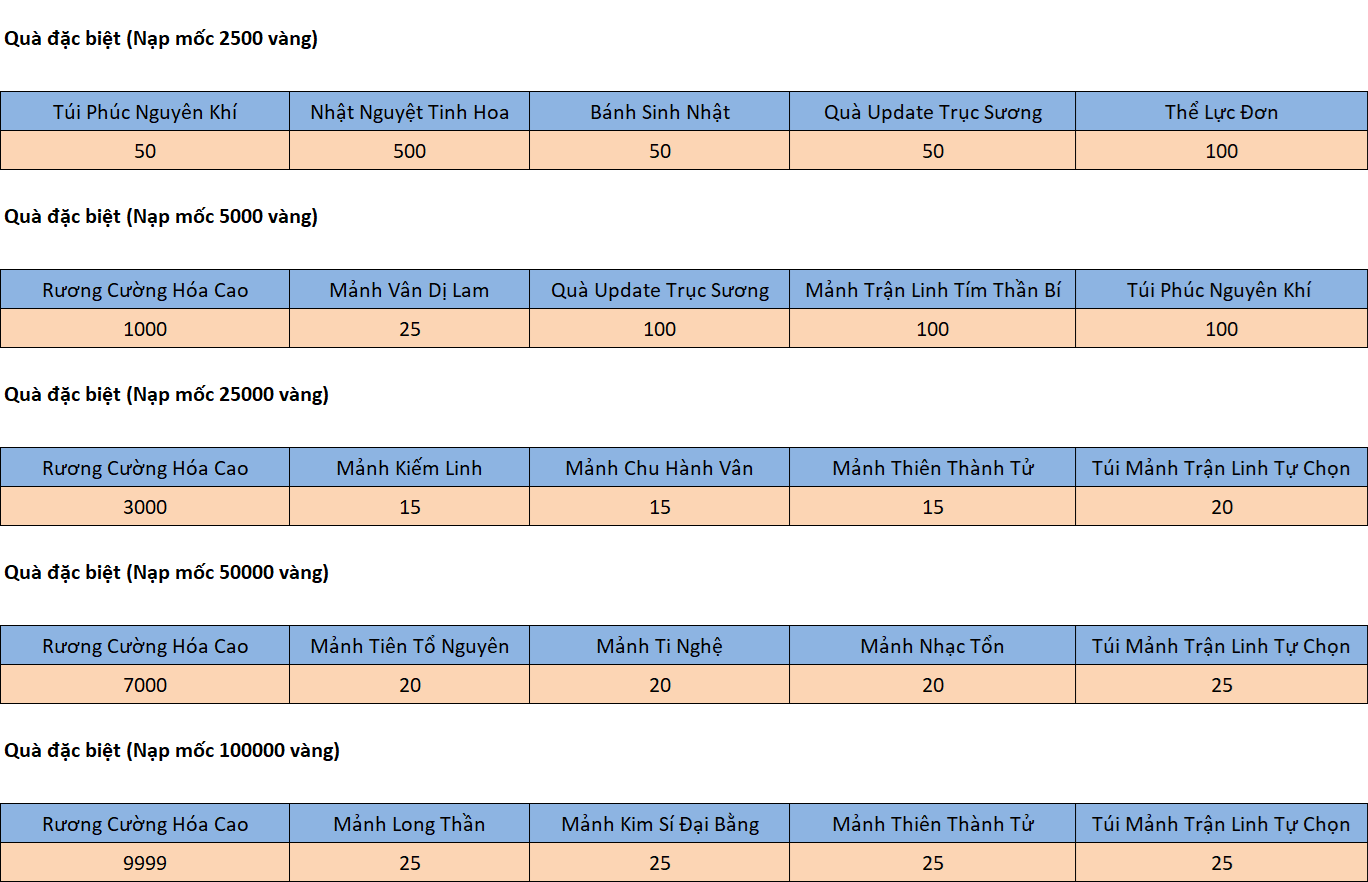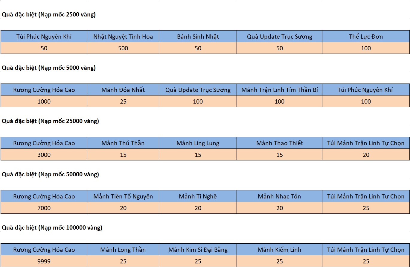 - Nạp tích lũy 2500 vàng trở lên sẽ nhận thêm QUÀ ĐẶC BIỆT 1 và x2 QUÀ TỪ MỐC 250 – MỐC NẠP