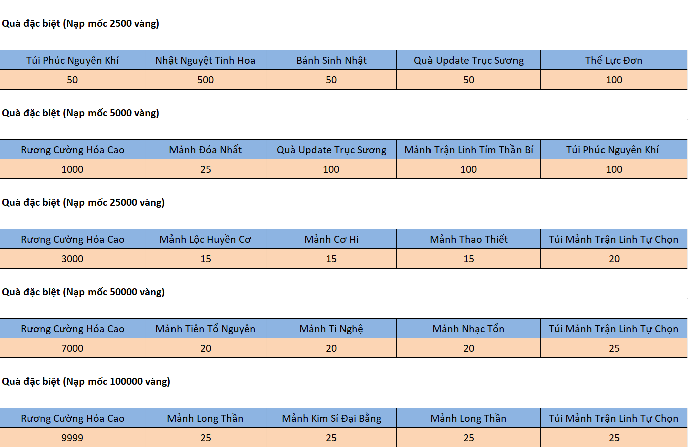 - Nạp tích lũy 2500 vàng sẽ nhận thêm QUÀ ĐẶC BIỆT 2 và x2 QUÀ TỪ MỐC 250 – MỐC NẠP
