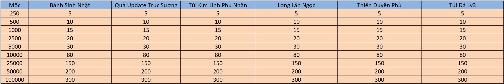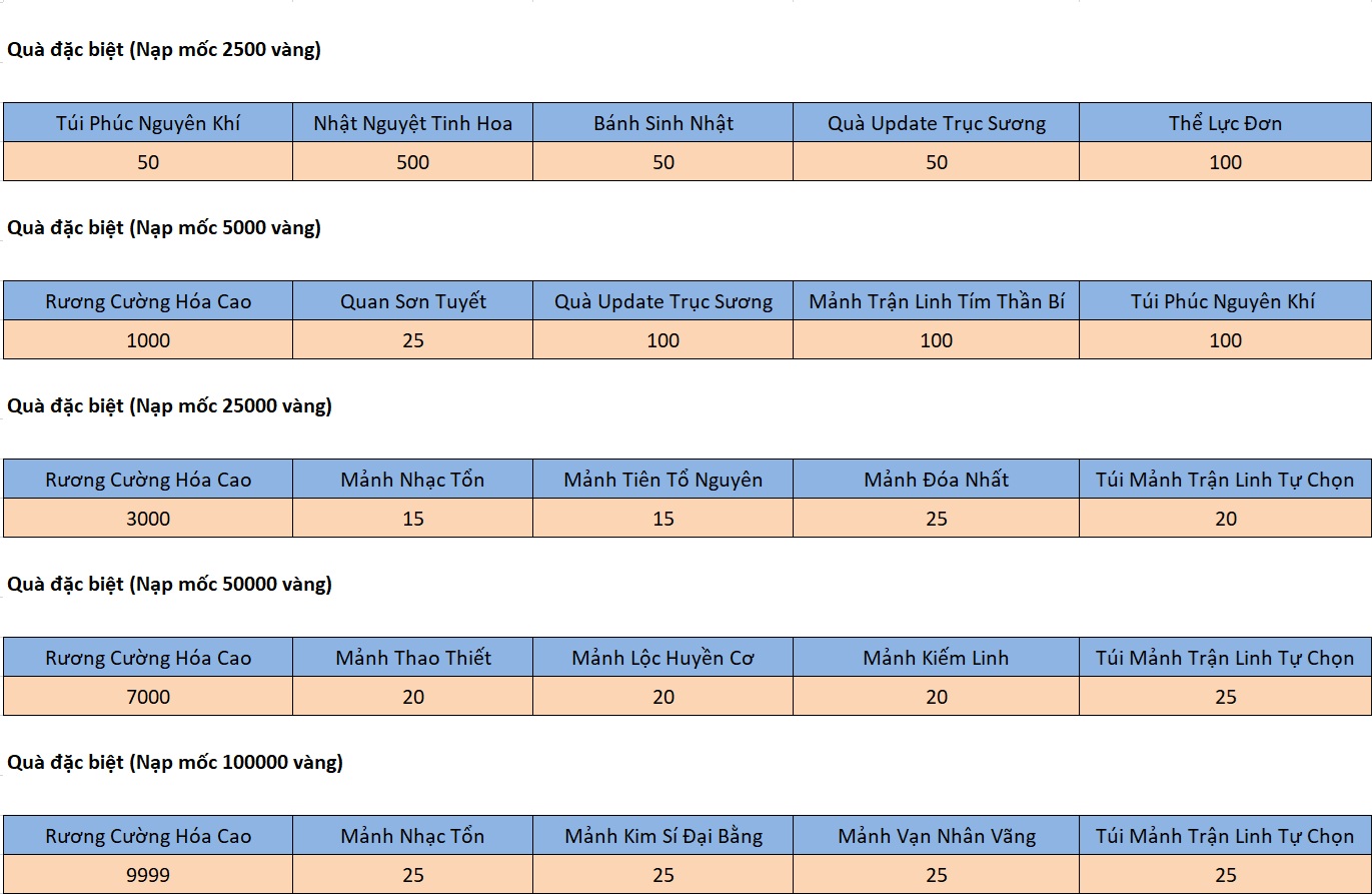 - Nạp tích lũy 2500 vàng sẽ nhận thêm QUÀ ĐẶC BIỆT 2 và x2 QUÀ TỪ MỐC 250 – MỐC NẠP